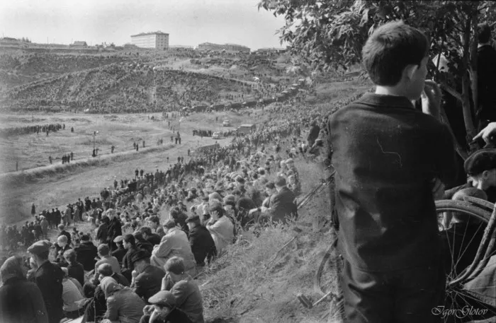 Зрители на дамбе и окрестностях Коммунального моста, на Военно-спортивном празднике. 1964 год. Новосибирск. Фотограф Георгий Викторович Жаннин-Перро