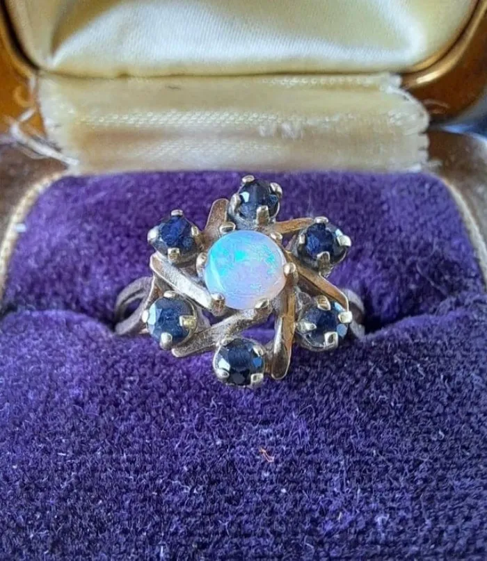 Эта находка обошлась в 200 долларов. Опал имеет красивые голубые и зелёные блики и окружен натуральными сапфирами, скорее всего, австралийского происхождения.