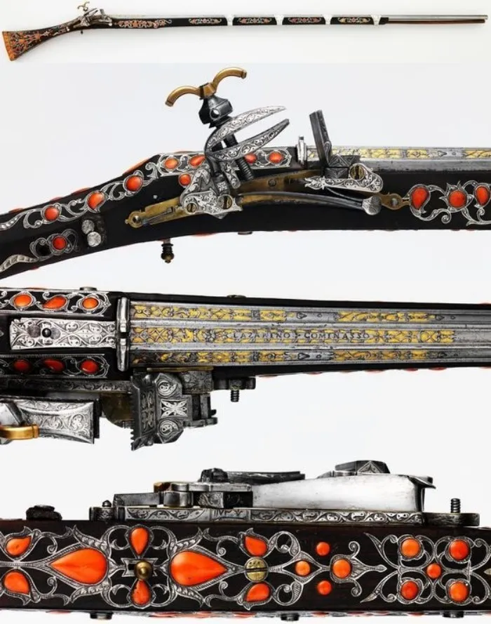 2. Алжирское ружье с микелетным замком, 1758-1759 год н.э. Дерево, сталь, серебро, коралл, медный сплав, золото. Длина 194 см, калибр 16,3 мм, вес 4,7 кг.