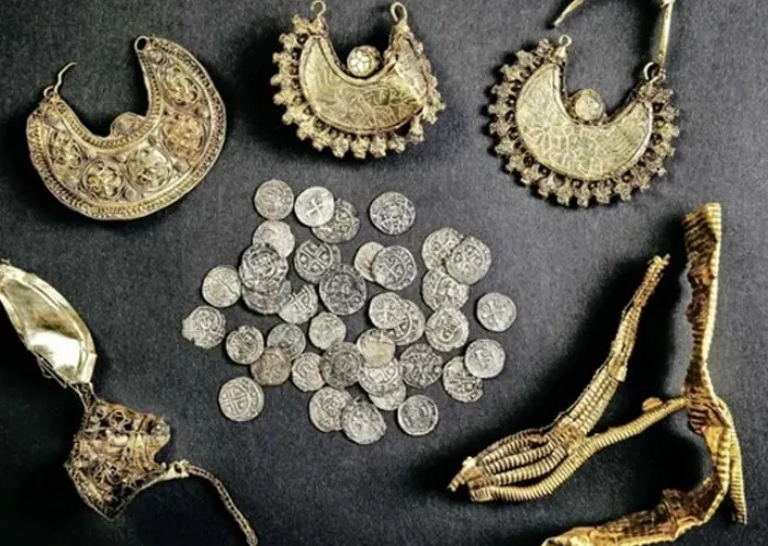 9. 4 золотые сережки, датируемые эпохой войны между Фризией и Голландией, 1000–1050 гг., и серебряные монеты 1200-1250 гг. Найдены в Хугвуде, Нидерланды