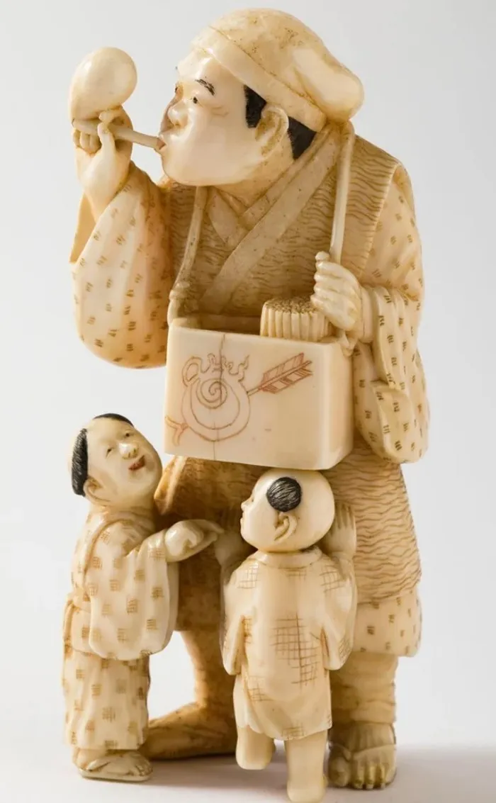 20. Статуэтка из слоновой кости, запечатлевшая мужчину с детьми, пускающего мыльные пузыри. Япония, 1870 год