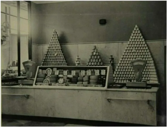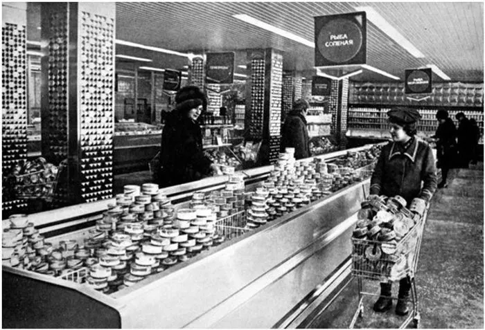 Люди, жившие в СССР, без труда вспомнят внутреннее пространство магазинов. В основном это были небольшие помещения с длинными рядами полок и холодильных камер. Бесконечные горки консервов украшали и заполняли пустые места.