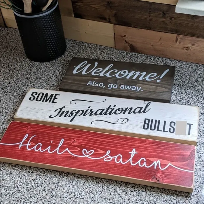 7. Вдохновляющий домашний декор: "Добро пожаловать! И проваливай", "Некоторое вдохновляющее д*рьмо", "Слава ❤️ Сатане"