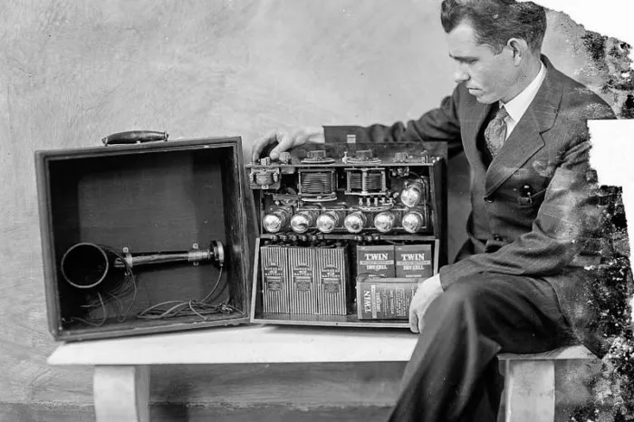 Брент Дэниел, бывший сотрудник радиолаборатории вашингтонского Бюро стандартов, демонстрирует разработанный им первый портативный супергетеродинный радиоприёмник. Семь радиоламп, батареи, антенна, динамик и остальные необходимые компоненты полностью помещаются в переносной корпус. С помощью этого устройства можно ловить радиостанции с Тихоокеанского побережья.