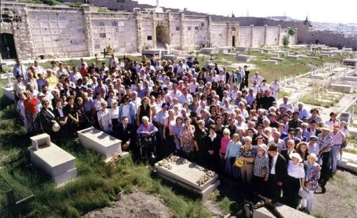 22. Спасенные Оскаром Шиндлером и их дети у его могилы на католическом кладбище на горе Сион в Иерусалиме, 1993 год