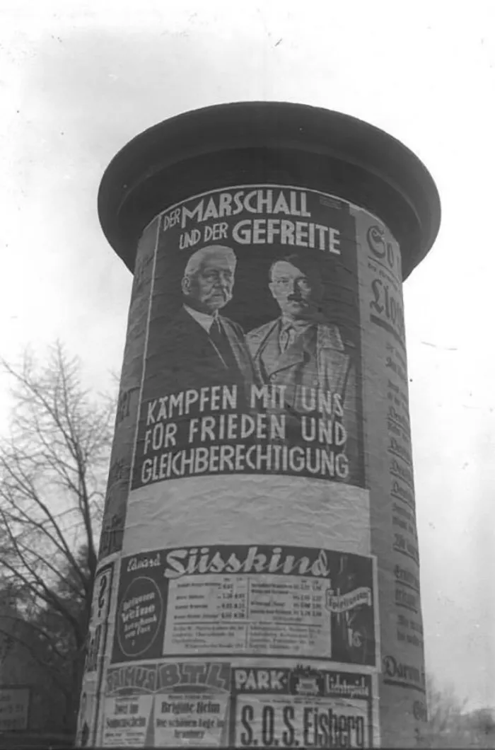 28. Предвыборный плакат с изображением Пауля фон Гинденбурга и Адольфа Гитлера с надписью: «Маршал и капрал сражаются вместе с нами за мир и равенство», ноябрь 1933 год