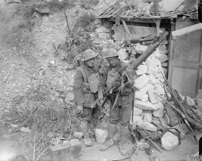 29. Пехотинцы британской 58-й пехотной дивизии с трофейным немецким ручным пулемётом MG-08/15, захваченным в ходе боев под Амьеном; август 1918-го года