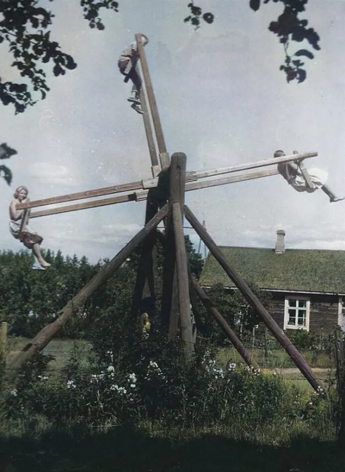 35. Семья катается на уникальных самодельных качелях для 4 человек в Финляндии, 1954 год