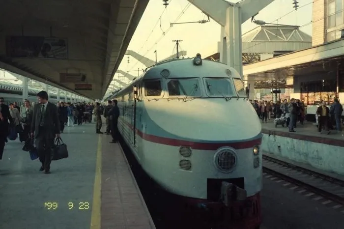 9. Электропоезд ЭР200-1. Первый и последний скоростной поезд СССР, 1999 год. В регулярной эксплуатации был с 1 марта 1984 года по 28 февраля 2009. Был ещё один электропоезд ЭР200-2, его доводили до "ума" уже в России.
