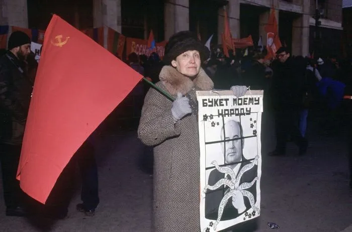7. Богатый улов, 1990 год. "Экономический кризис в Москве. Москвич демонстрирует несколько банок с едой, которые он смог получить, прождав два часа перед государственным рыбным магазином."