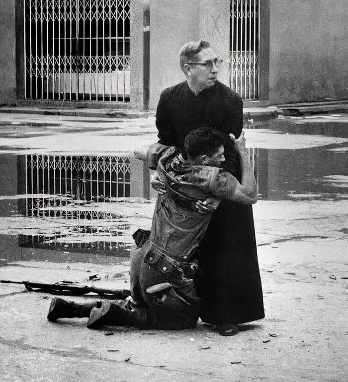 11. Отец Луис Мануэль Падилья держит раненого правительственного стрелка, застреленного на улицах Пуэрто-Кабельо, Венесуэла
