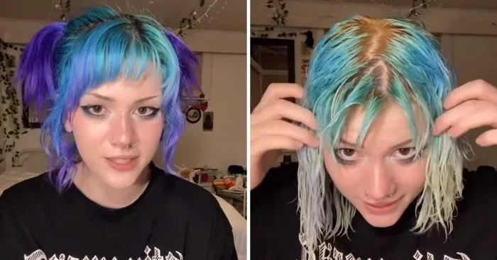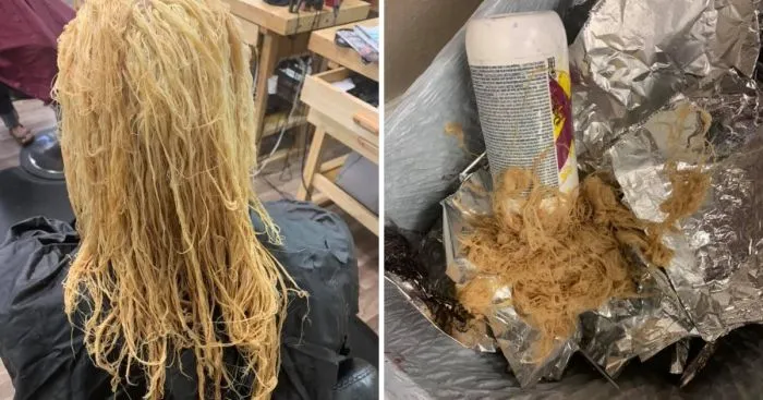Девушка обесцветила волосы дома, а затем использовала средство для выпрямления