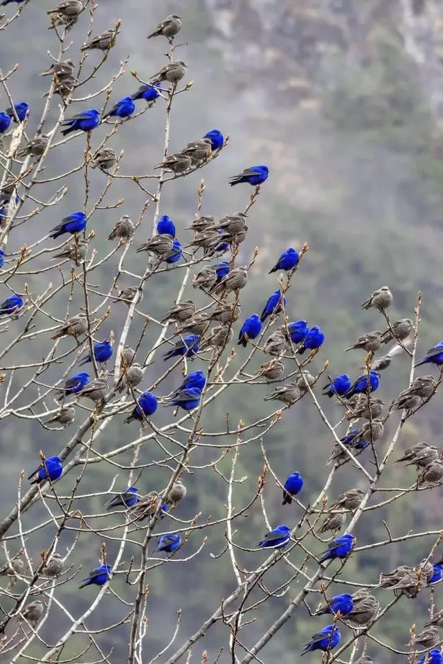 Самцы окрашены в ярко-синий. Самки же носят нейтральное серое оперение.