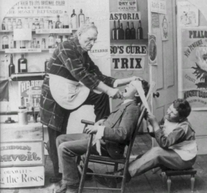 Больному выдергивают зуб, одновременно с этим придавливая его голову к спинке кресла с полотенцем. 1872 год.