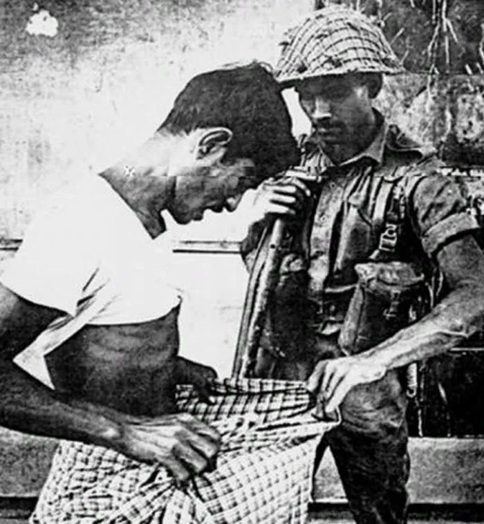 Военное время. Солдат из Пакистана проверяет «операционное» место после принудительного обрезания у молодого парня из Бангладеша. Пакистан, 1971 год. Обрезание чаще всего присуще мужчинам, проповедующим ислам. Это проверяли. В плохом случае люди признавались отделенными от массовой идеологии и отправлялись на казнь.