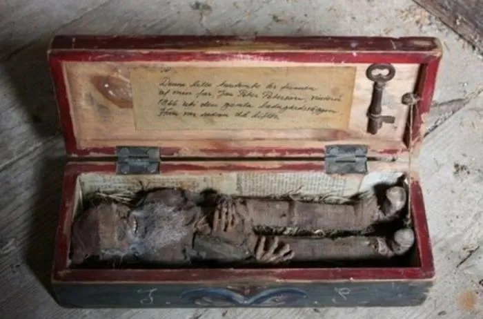 Мумия шведского домового/гоблина. 1866 год. На шкафчике было написано: «Мертвое тело этого существа нашел мой отец, Ян Петер Петерсон, зимой, в 1866 году, между стенами в старом амбаре».