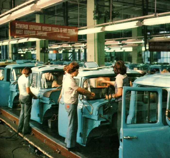 Конвейер сборки кабин в старом кузовном корпусе Завода им. Лихачёва, Москва, СССР. 1979 год