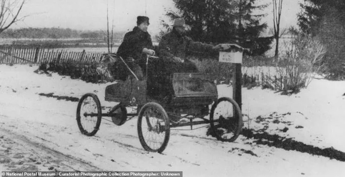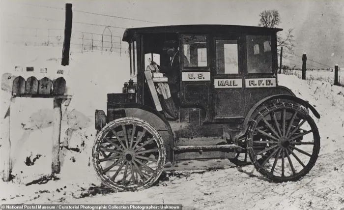 Фото из архива Национального почтового музея, который приводит комментарий: «Перевозчиков Rural Free Delivery (RFD) призвали заменить лошадей и фургоны на новейшие транспортные технологии. Этот неизвестный перевозчик покрасил ранний электромобиль той же краской и по той же схемой, что и повозки RFD той эпохи. Очевидно, что зимой он способен передвигаться по своему маршруту только благодаря расчищенной дороге».