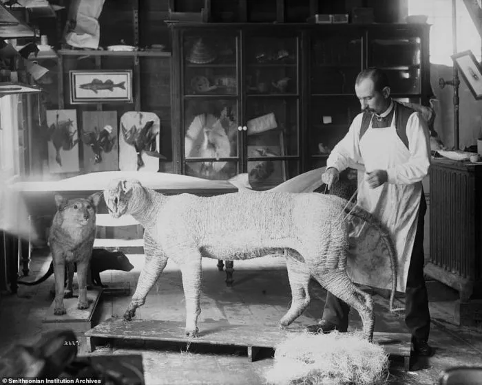 9. Таксидермист Уильям Темпл Хорнадей работает над чучелом тигра в магазине за зданием Смитсоновского института в Вашингтоне, округ Колумбия. 1880-е годы
