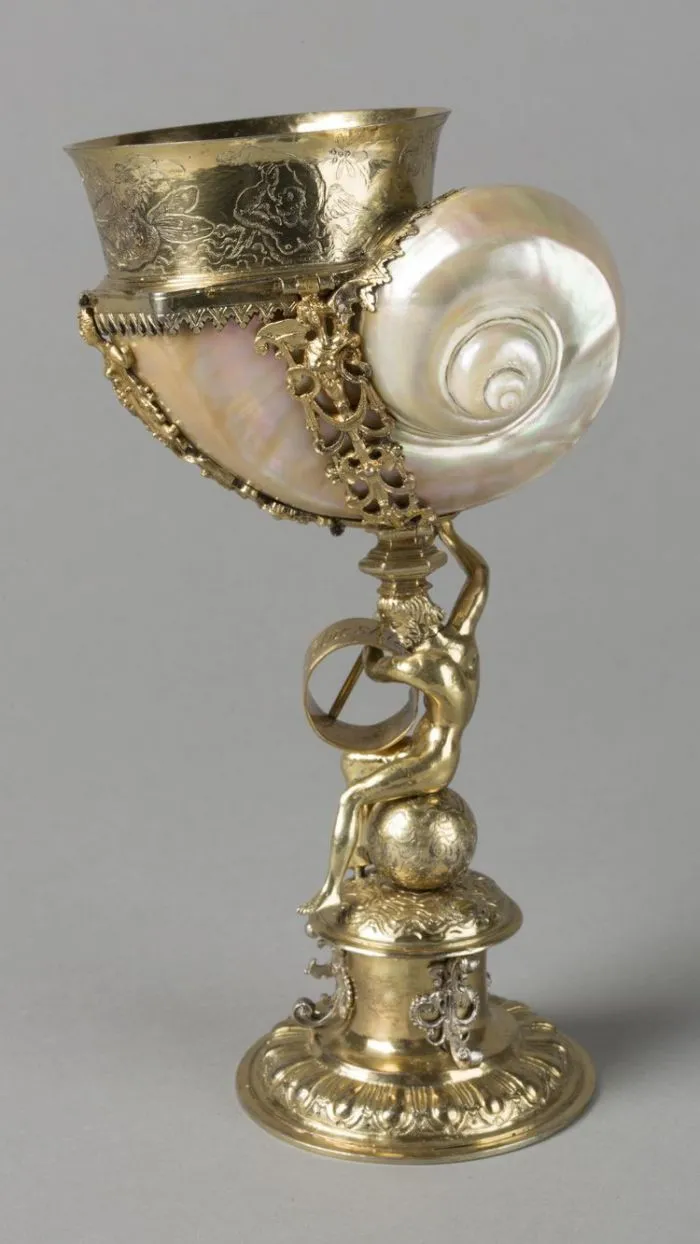 Кубок из наутилуса 17 века. Фигура в его основании — это Нептун, а резные фигурки изображают бога Нерея и купидонов, едущих на морских коньках. Музей Чарторыйских в Кракове, Польша