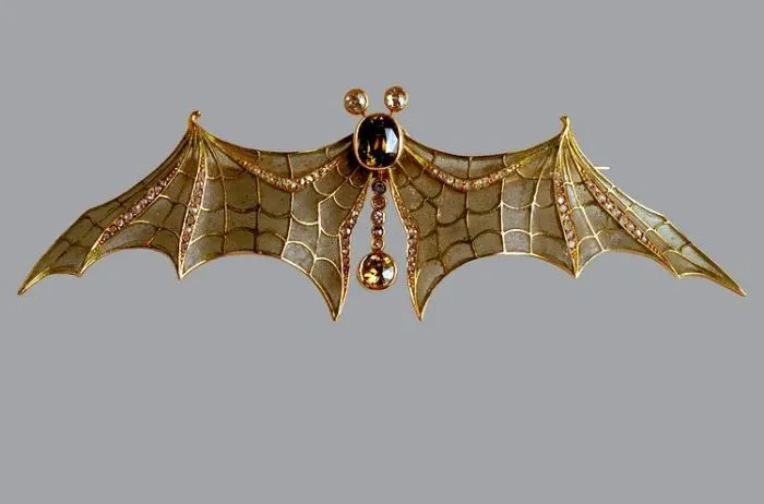 Брошь в виде летучей мыши, в стиле модерн, изготовленная из золота, витражной эмали и бриллианта. Европа, 1905 год
