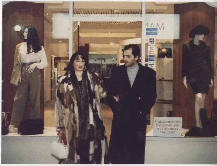 16. Покупатели при выходе из модного магазина одежды. Россия, 1990-е годы.