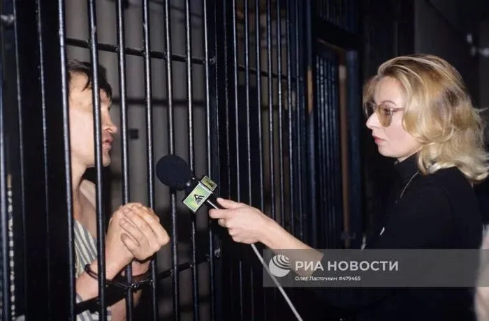 17. Ведущая программы «Дорожный патруль» берёт интервью в изоляторе временного содержания у задержанного,1997год.