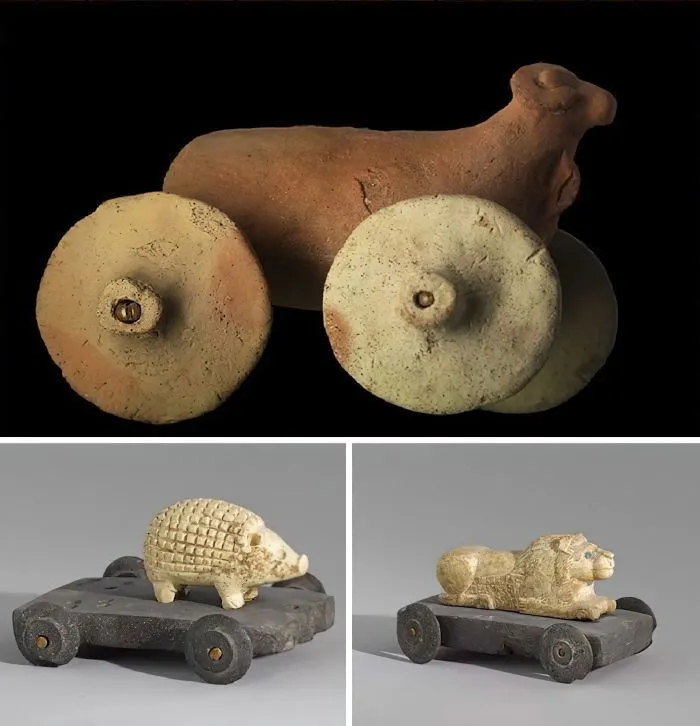 15. Доисторические детские игрушки — фигурки животных возрастом более 3000 лет, установленные на маленьких тележках. Выставлены в Лувре в Париже