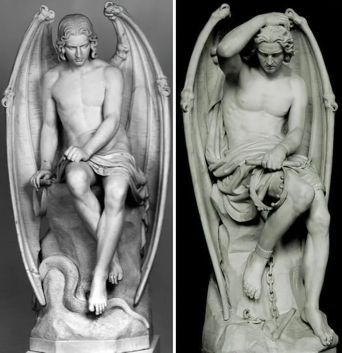 21. В 1842 году Джозеф Гифс вырезал Ангела Зла (статуя слева) для установки на кафедре Льежского собора, но её убрали из-за отвлекающего очарования и «нездоровой красоты»