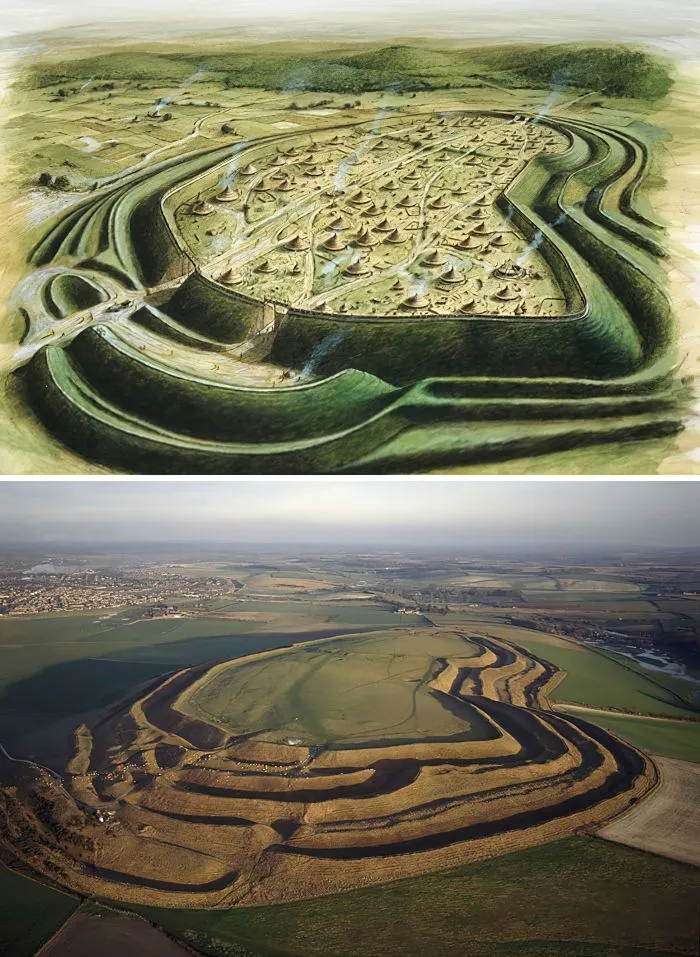 28. Тогда и сейчас: Мэйден-Касл. Земляное фортификационное сооружение железного века, самое большое в Англии