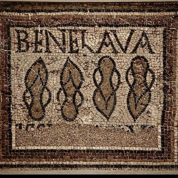 40. Мозаика на полу, найденная у входа в римскую баню в античном городе Тимгад в Алжире, с надписью «Бене Лава» («Добрые пожелания»). Датируется I и II веками нашей эры
