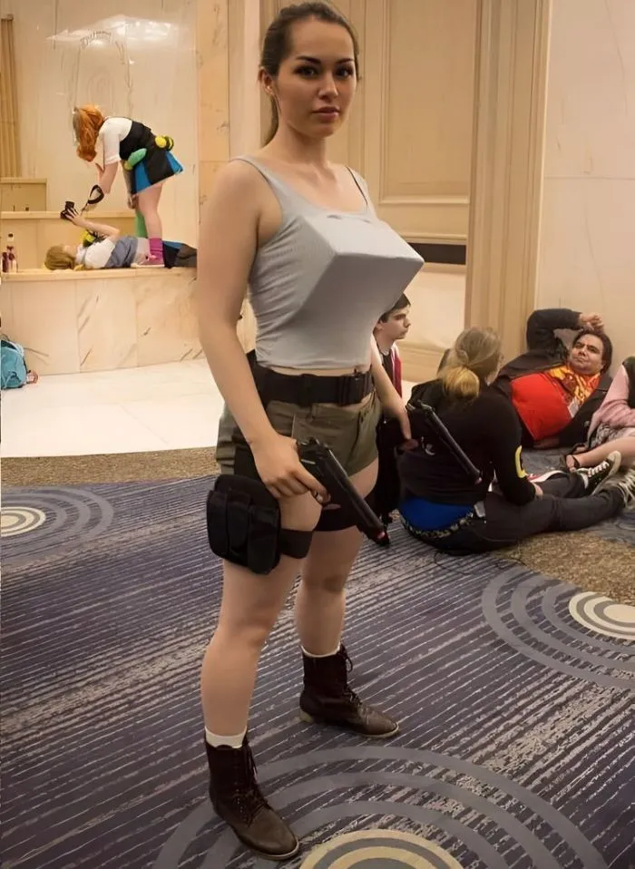 С косплеем на персонажа Лары Крофт из видеоигры всё понятно, но что происходит на заднем плане?