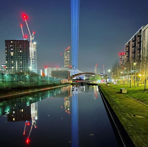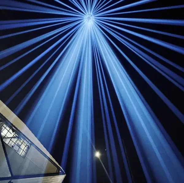 Инсталляция представляет из себя лучи света, устремлённые в небо.