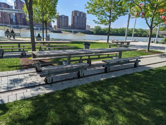 10. Эти скамейки для пикника установлены на старых трамвайных путях, так что их легко сдвигать или разъединять