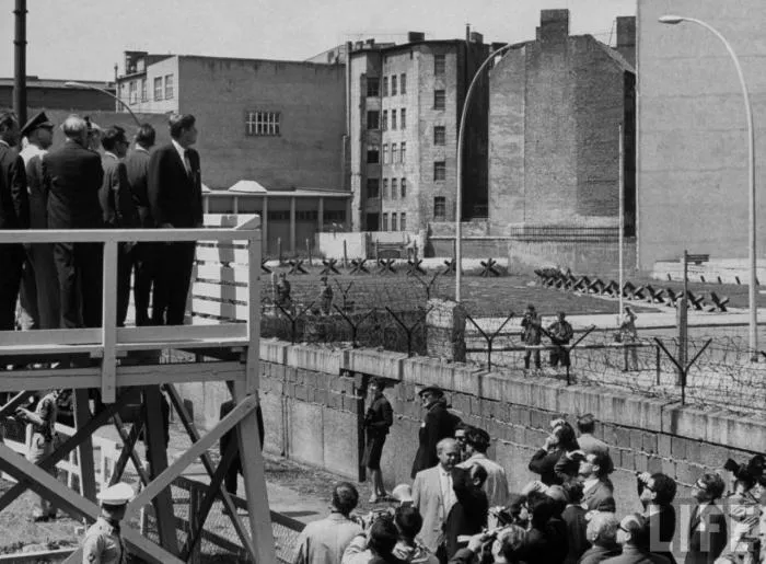 К слову на следующей фотокарточке президент Америки. Джон Кеннеди тоже посещал Берлин с визитом и не отказал себе в удовольствии полюбоваться творением рук человеческих. Мы не знаем, о чём он думал в тот момент, но сдаётся мне, что тогда в марте 1963 года никто и вообразить себе не мог, что через 30 лет никакой стены не будет. Настолько незыблемой казалась созданная система.