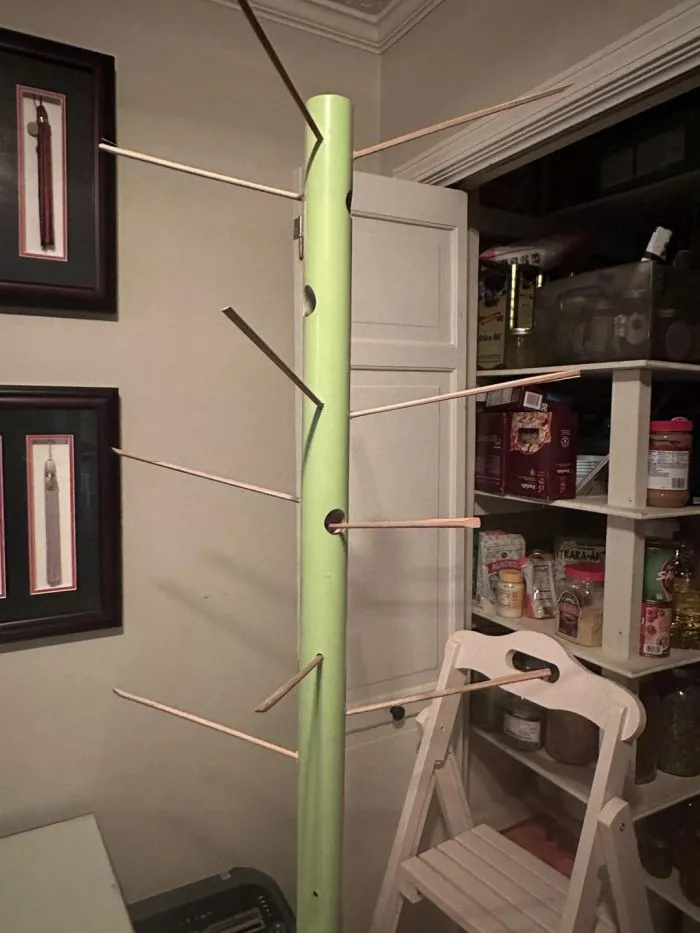 13. Я сделал сушилку для пасты из старой вешалки и палочек для еды, и теперь моя собака не может их достать
