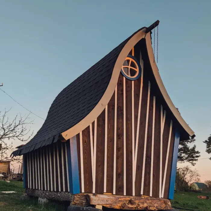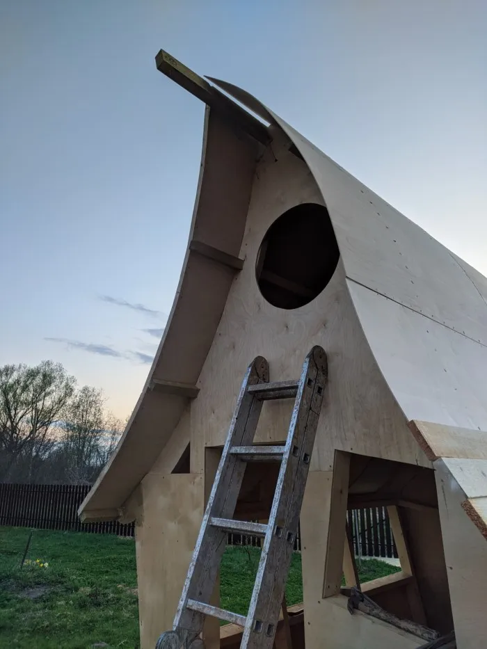 За основу стен был взят каркасс, усиленный фанерой. От использования традиционной ОСП отказался по причине её не эстетичности - всë таки это сказочный домик, а не утилитарный сарай. Крыша моего сказочного домика - отдельная тема. На неё ушло больше всего времени как в проектировке так и в возведении.