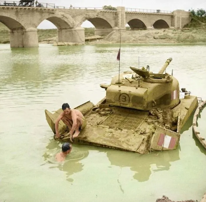 7. Британские танкисты купаются в реке Биферно на юге Италии, октябрь 1943 года