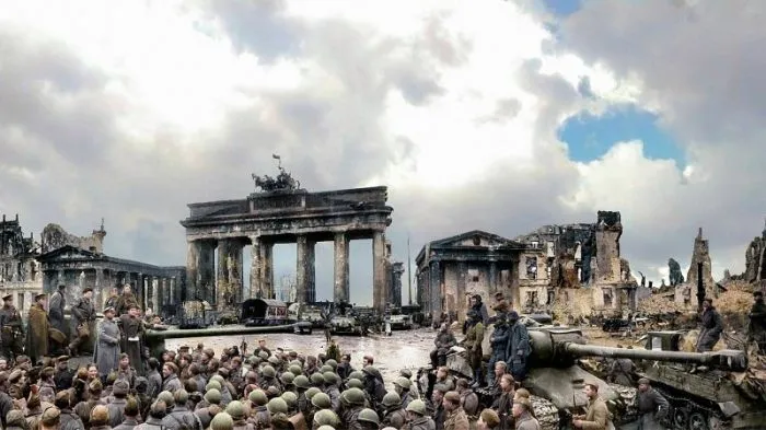 12. Евгений Долматовский читает стихи у Бранденбургских ворот, 10 мая 1945 года, Берлин
