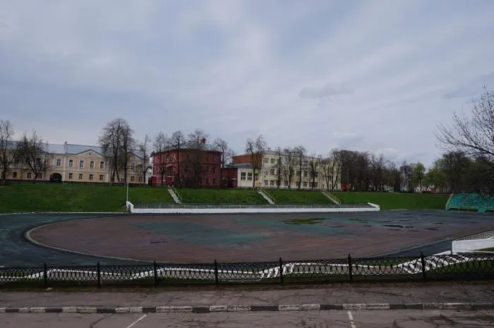 Ярославль настолько перегружен церквями в центре, что даже стадион зажат между ними.