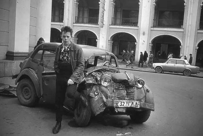 14. Модный пацан у Гостиного двора на фоне разбитого Москвича