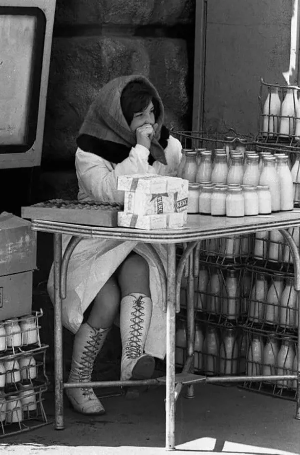 16. Продавщица молочного отдела. В маленьких баночках сметана, а в бутылках молоко. 1970-е