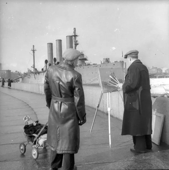39. Художник и крейсер Аврора. Фото Евгения Халдея. 1954 год