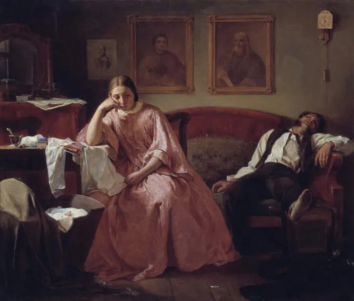 Первоначально она называлась «Двадцатое число». В этот день госслужащим выдавали зарплату, но потом название почему-то поменяли. Как видим, зарплату свою глава семьи домой не донес. Перед женой лежит его пустой кошелек. Часы показывают почти 7 часов. Слева в зеркале отражается створка окна, и падает утренний свет. Вероятно, женщина так и ждала мужа, не раздеваясь, а чиновник заявился домой только под утро. Вообще эта картина довольно интересна обилием деталей. Довольно много полотен «о вреде пьянства и алкоголизма», в том числе в российской живописи. Но обычно там изображены либо подчеркнуто бедные семьи, либо и вовсе маргиналы, и все словно кричит о неблагополучии в доме. В данном же случае художник показывает нам семью, которая, на первый взгляд, откровенно неблагополучной не выглядит. Обстановка не богатая, но и не откровенно бедная, скорее, «мелкобуржуазная». В комнате хорошая мебель, герои прилично одеты и вполне могли бы быть счастливы, если бы не легкомыслие супруга. При этом в то время львиная доля населения крупных городов жила в долг, особенно в столичном Петербурге. Почти все люди платили за аренду жилья, за товары часто отдавали деньги не сразу, а записывали купленное в так называемые «заборные книжки», а потом погашали общий счет. Подобные отсроченные платежи помогали перебиться в случае внезапных финансовых «катаклизмов», однако при постоянных финансовых трудностях долги только росли.