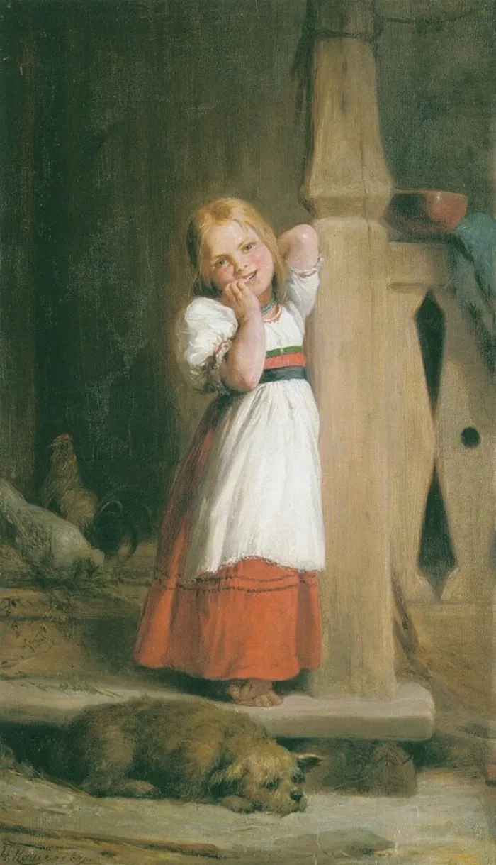 «Дети, катающие пасхальные яйца» - самая старая из сохранившихся работ автора. На ней изображена старинная пасхальная забава. Дети катали яйца с наклонных поверхностей. Яйца для этого могли идти в ход и не освященные в церкви. Этот милый сюжет часто встречается в русской живописи 19 века.