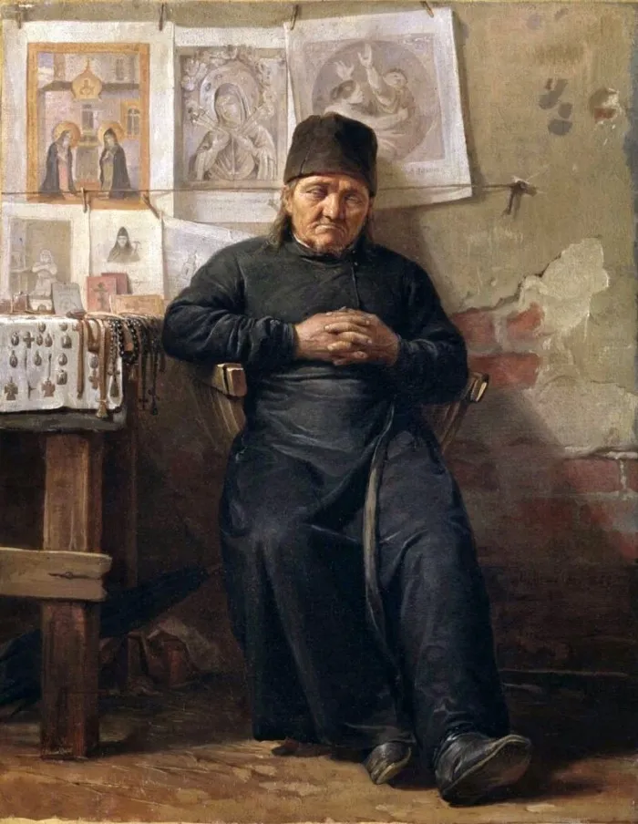 Или вот дремлющий продавец образков. Примечательно, что в Москве была забавная традиция: продавцы икон свой товар не продавали, а «меняли на деньги». Поэтому, зайдя в лавку, покупатель, указывая на заинтересовавшую икону спрашивал, на что ее меняют, а продавец отвечал, что меняет на столько-то рублей.