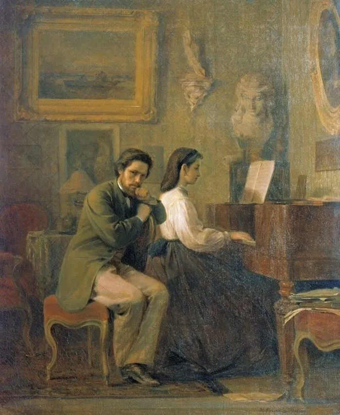 «Кошелев Н. А. и Крамская С. Н. (урок музыки)» (1865)
