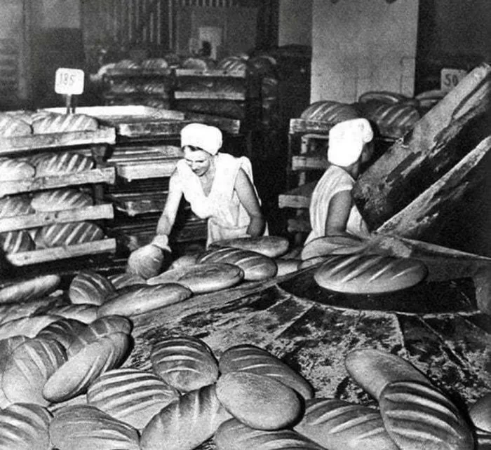 22. Работницы хлебопекарни укладывают в поддоны вкуснейшие батоны по 25 коп. штука. СССР. 1970-е