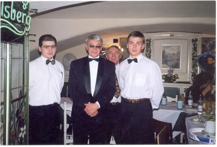 Актёр Александр Демьяненко с работниками ресторана. Россия, 1990-е годы.