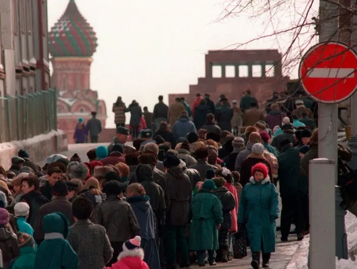 Очередь к Мавзолею, открывшемуся после перерыва на волне дебатов о захоронении тела Ленина. Москва, 1997 год.